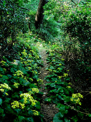 滑り出しは順調に、木や石で組まれた階段や道を辿っていたのだが、いつの間にやらシダ類が生い茂った道なき道になり、所々で見かけていた木製のベンチはとうの昔になくなった。